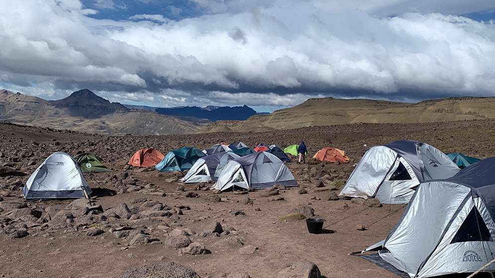1. Probable aspecto en vida del Patagorhynchus pascuali. Ilustración de Santiago Miner (LACEV). 2. Diente de Patagorhynchus. Imagen: gentileza investigadores. 3. Reconstrucción del cráneo de Patagorhynchus pascuali. Reconstrucción de Santiago Miner (LACEV). 4. El diente de Patagorhynchus mide unos 5mm de diámetro. Foto: gentileza investigadores. 5. Vista del campamento (Marzo 2022). Foto: gentileza investigadores.