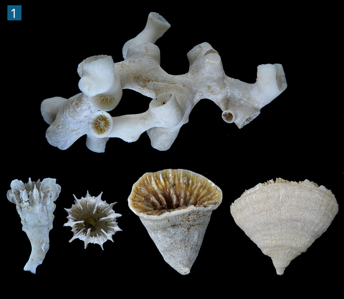 Figura 1: Ejemplos de corales duros del Mar Argentino. Arriba: Bathelia candida (10cm de largo). Abajo a la izquierda: Javania cristata (2,5cm de ancho). Abajo a la derecha: Flabellum spp. (2-2,5cm de ancho).
