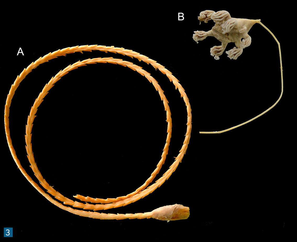 Figura 3: Pennatuláceos. A: Distichoptilum sp., ejemplar de aproximadamente 20cm de alto. B: Umbellula sp., ejemplar de 10cm de alto.