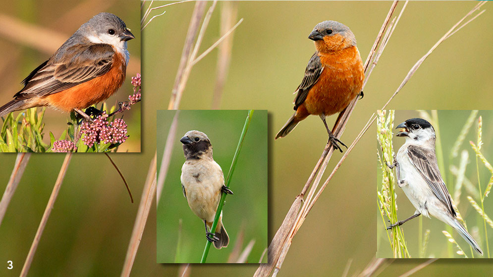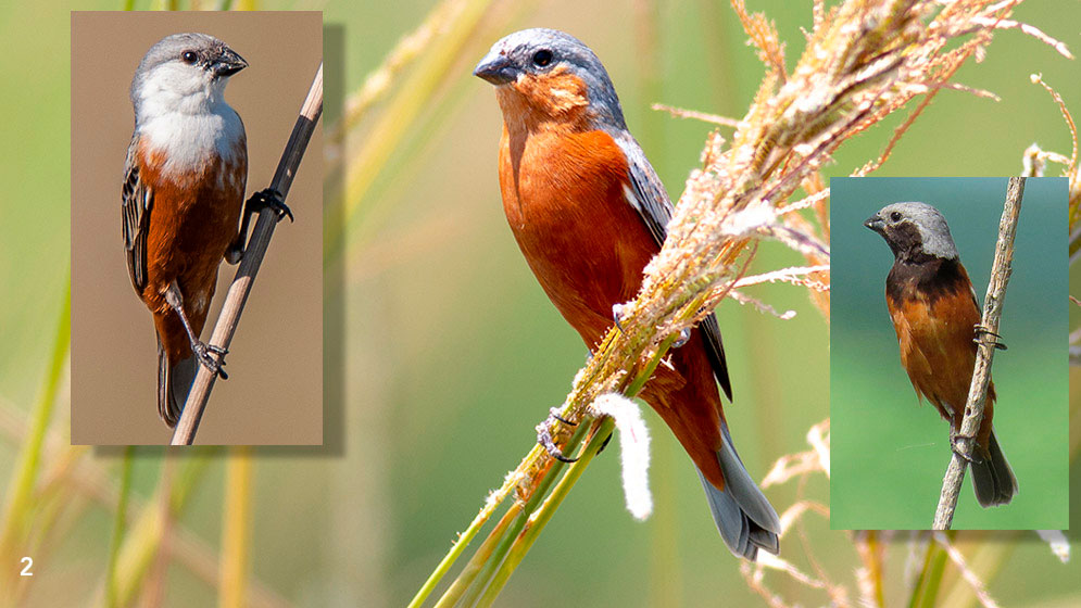 3- Las distintas especies de capuchinos poseen diferentes patrones de coloración Fotos: Steven Whitebread (Macaulay Library at the Cornell Lab of Ornithology)/ Sheila Turbek (2 y 3)/ Marcelo Fernandes (MLCLO).