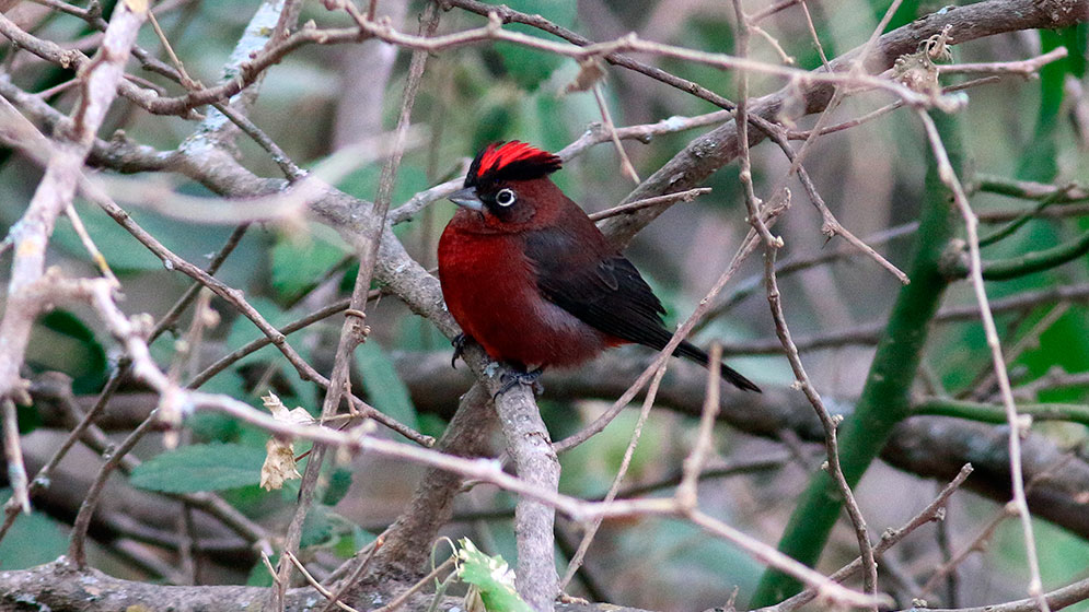 - El brasita de fuego (C. cucullatus), la única especie analizada cuya separación entre poblaciones mostró débil asociación con el eje R. Paraná-Paraguay. Crédito: © Steve Walker /Macaulay Library ML65840571.