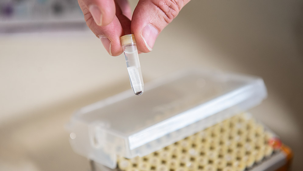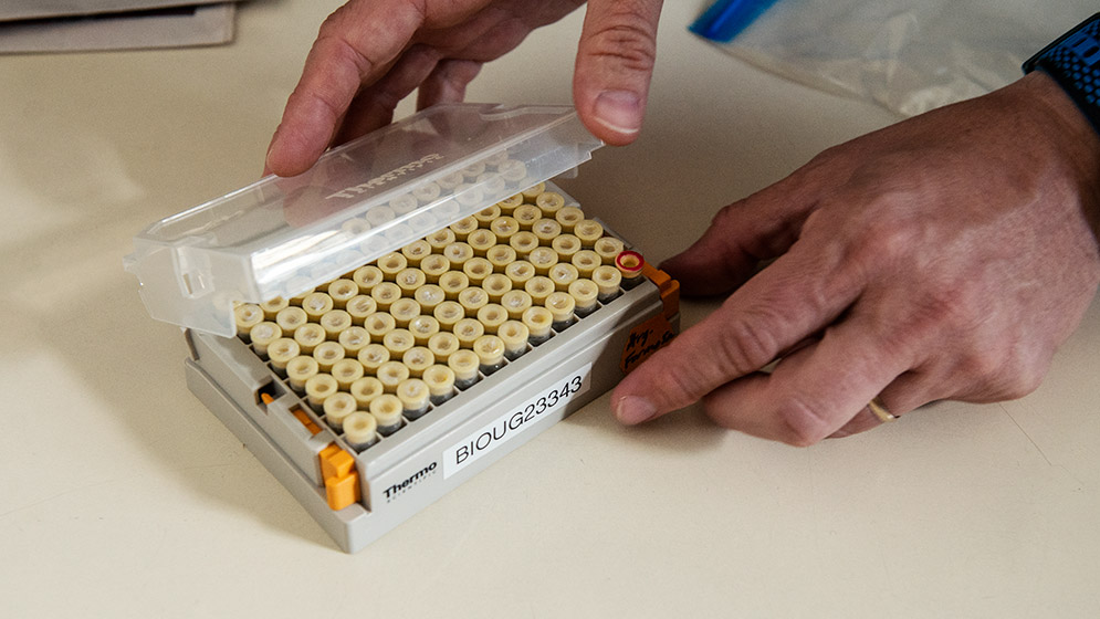 4. Caja con 95 ejemplares de tamaño intermedio en etanol colectados por la trampa Malaise luego de su procesamiento en el laboratorio molecular. Foto: CONICET Fotografía/ Verónica Tello.