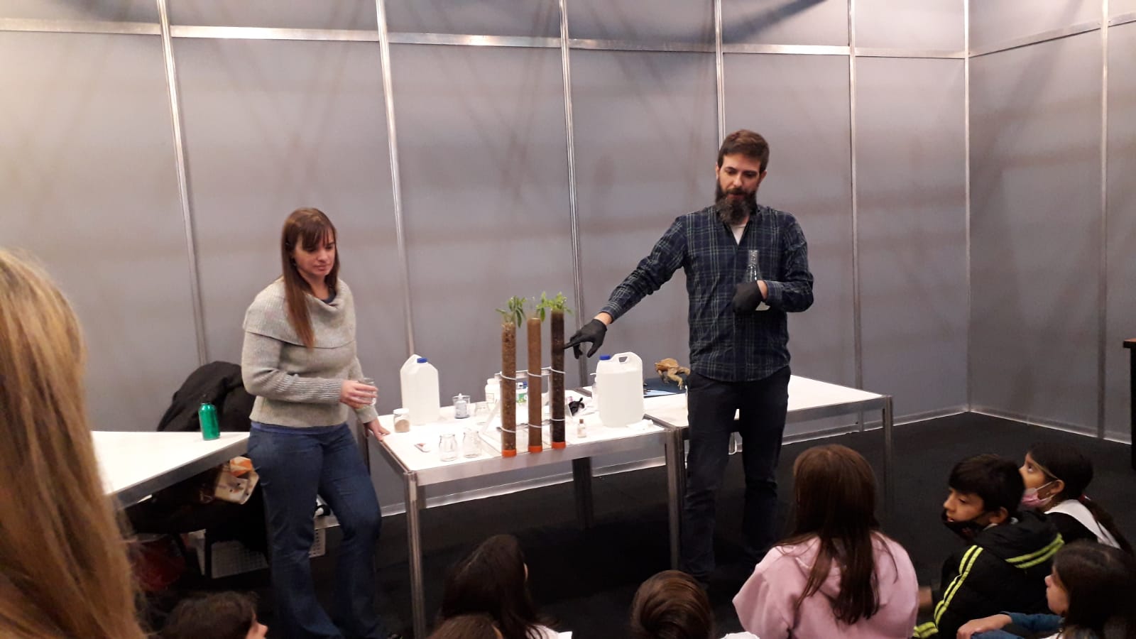 Foto 2: Gabriel Basílico y Daina Ferraro (Limnología) en el Espacio Explora, Solydeus, de la feria del libro.