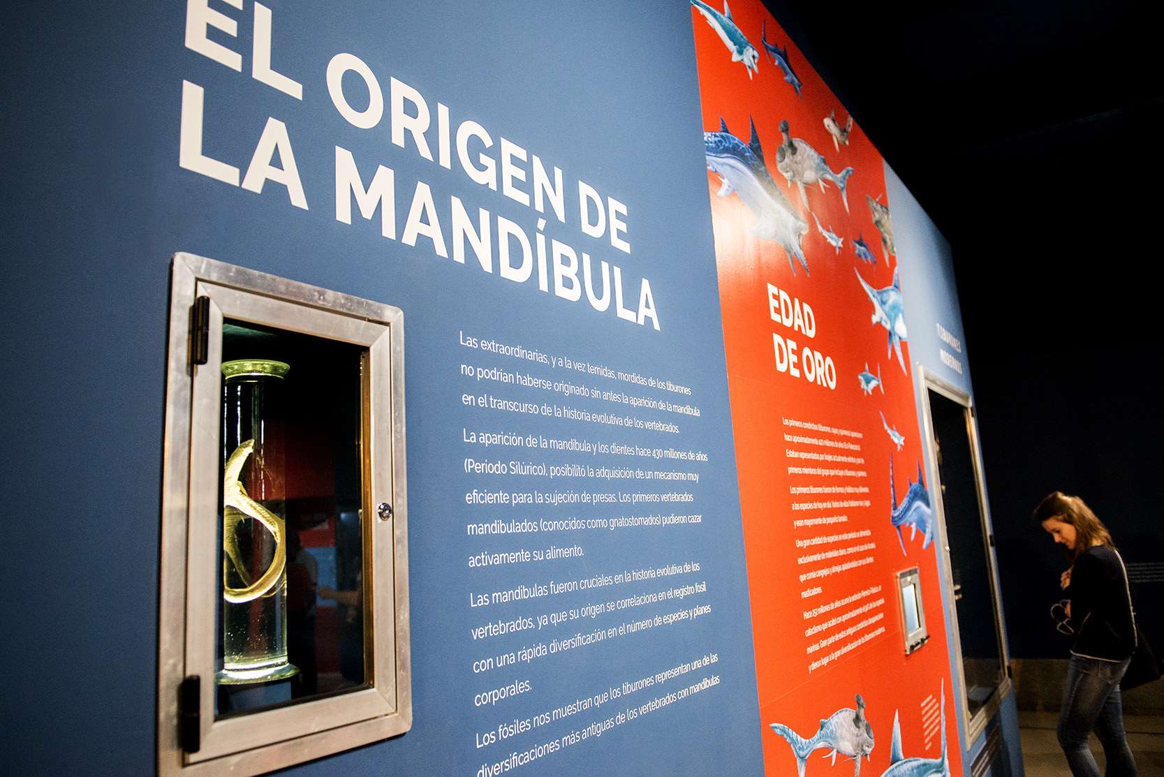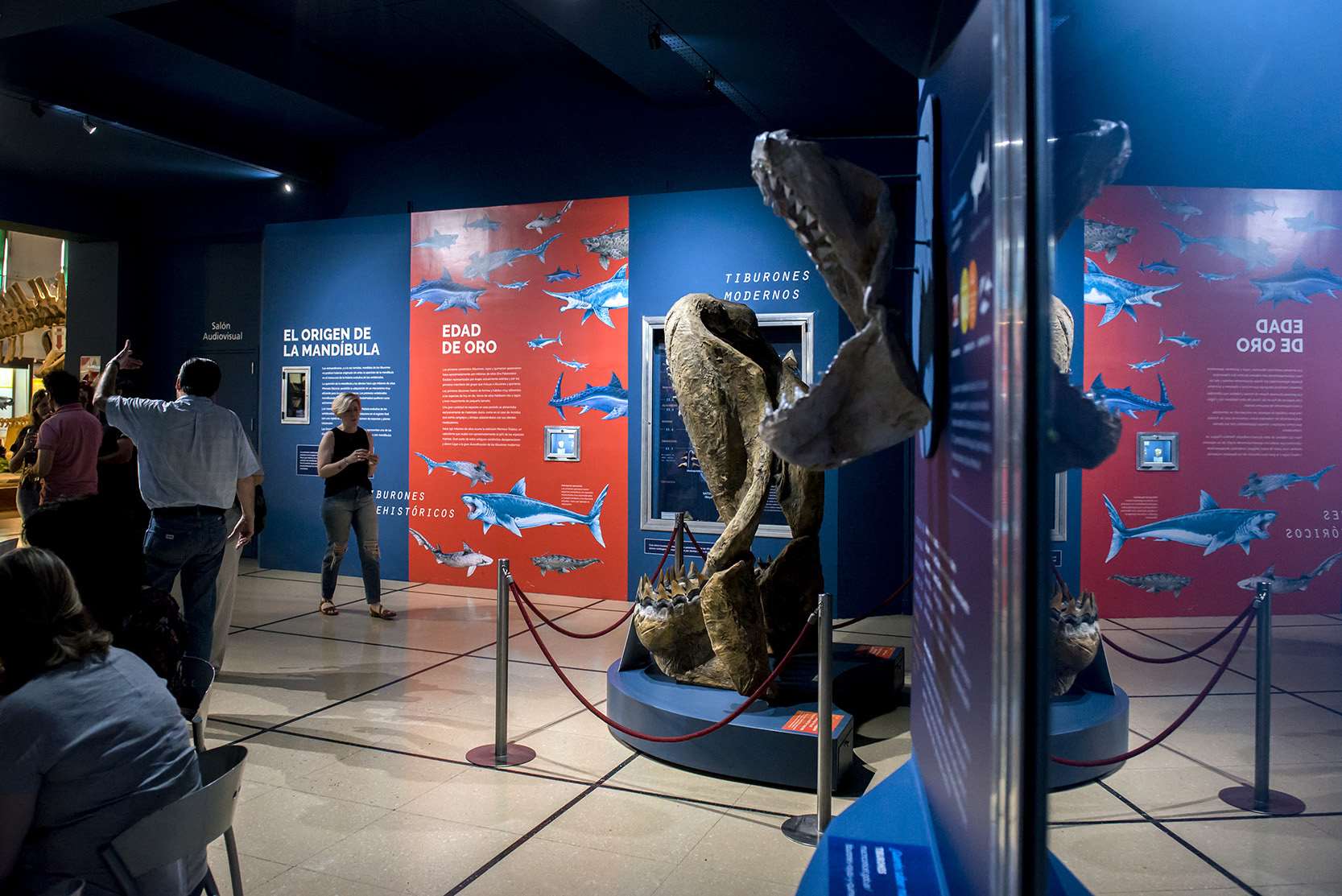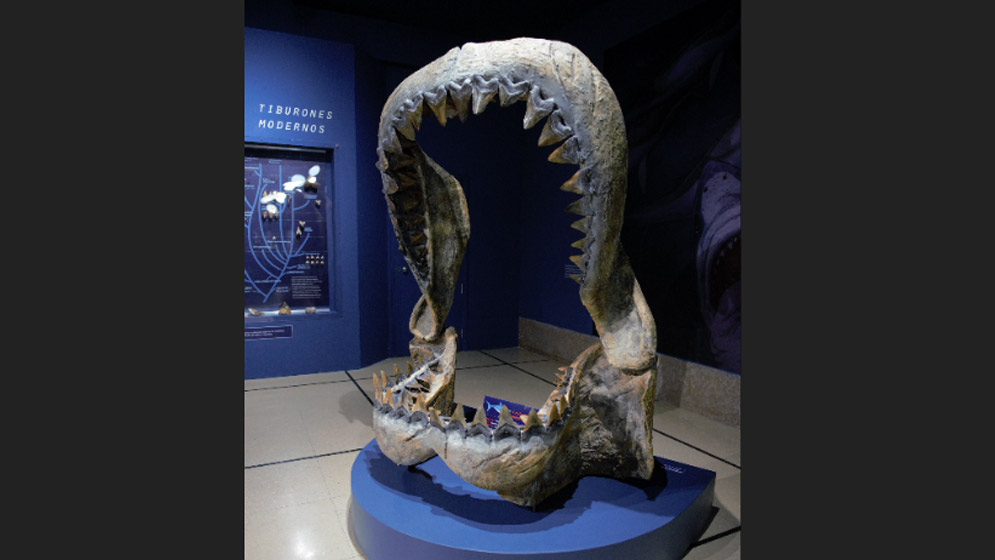 Una colección única de dientes fósiles de distintos tiburones nos muestra cómo evolucionó este grupo de peces a partir de los primeros vertebrados sin mandíbula. La reconstrucción en tamaño real de la mandíbula del tiburón Megalodón (Carcharocles megalodon) permite tomar dimensión del tamaño de uno de los mayores predadores marinos que haya existido.