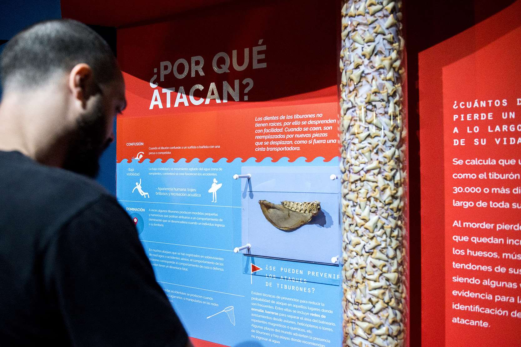 Diferentes módulos de la sala muestran que lejos de ser un grupo de animales peligrosos para el hombre, es éste el que pone en peligro a los tiburones y rayas debido a la sobreexplotación pesquera, la contaminación y destrucción de su hábitat.