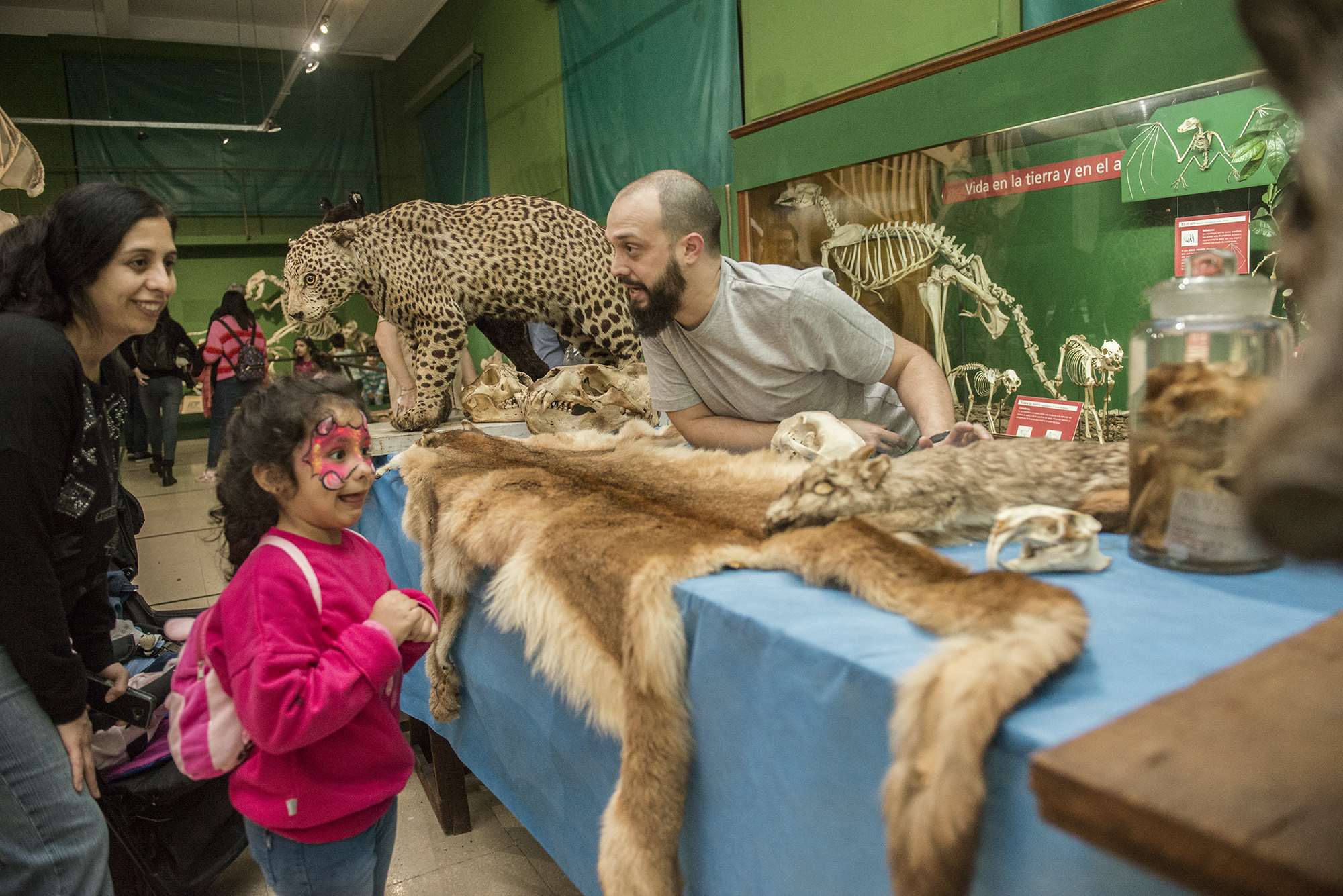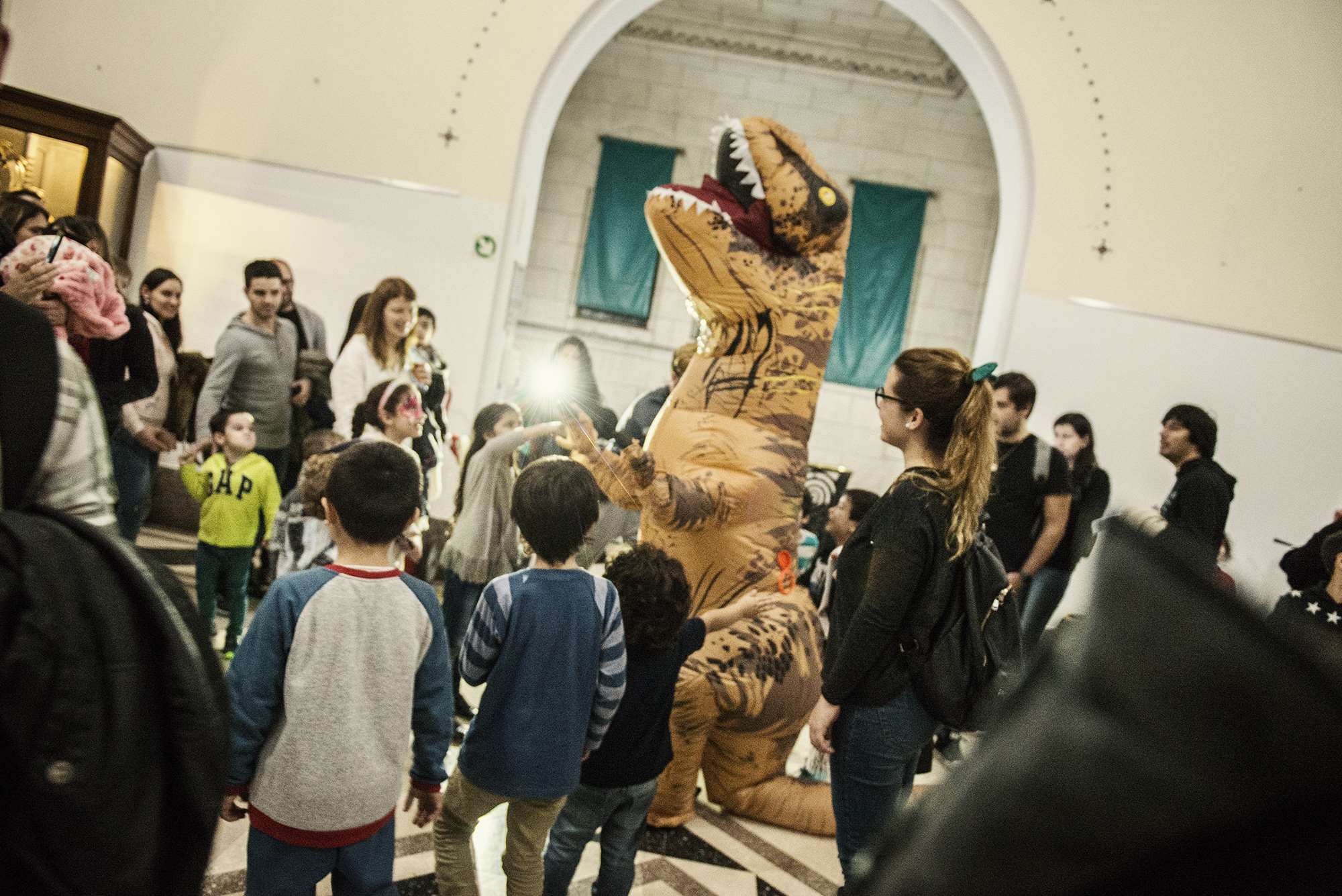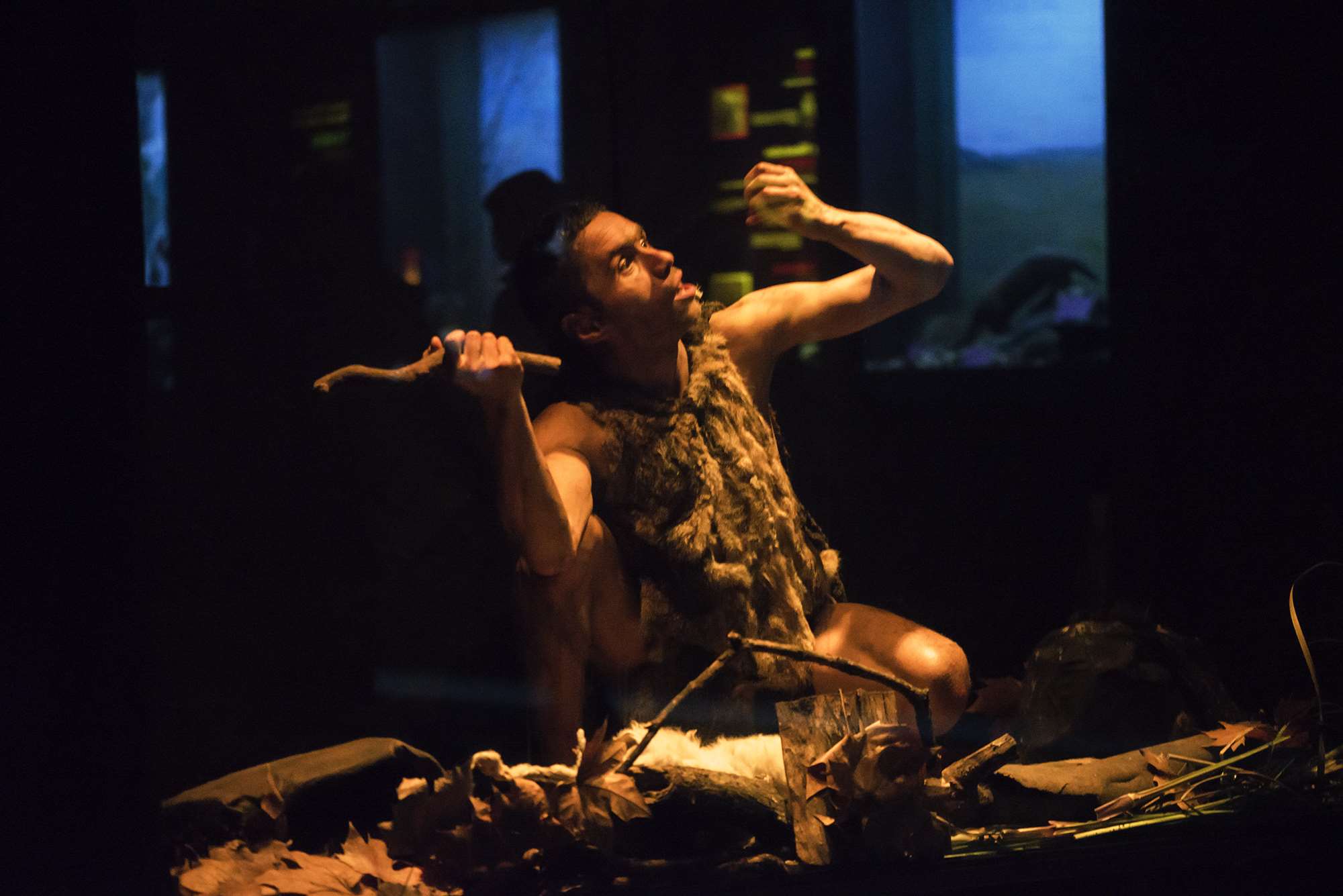 Lo más llamativo de la noche fue la representación actoral de un hombre prehistórico dentro de una vitrina en la sala de Mamíferos; los sorprendidos visitantes observaron recreaciones de situaciones y conductas de nuestros ancestros en su vida cotidiana.