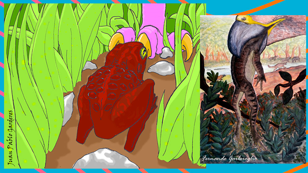 Der: reconstrucción de Calyptocephalella sabrosa. Crédito: Juan P. Garderes. Izq; reconstrucción de un ave rapaz comiendo una C. sabrosa. Crédito: Fernando Garberoglio.