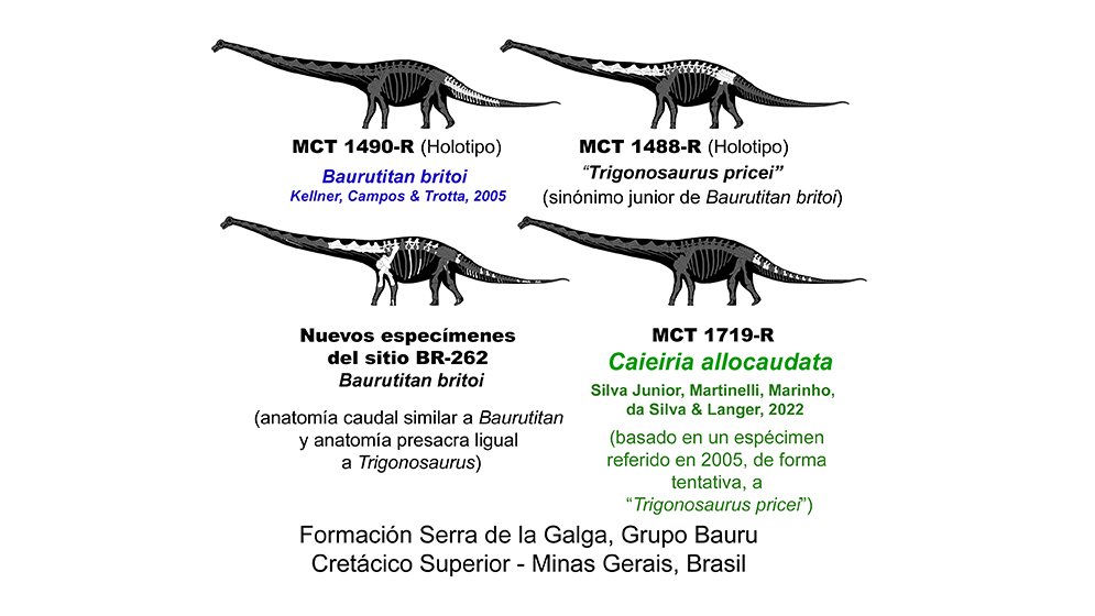 Esta semana salió publicado en la revista internacional PeerJ un estudio sobre fósiles de dinosaurios titanosaurios encontrados en Peirópolis, municipio de Uberaba, Estado de Minas Gerais, Brasil, que aportan datos relevantes sobre este grupo de saurópodos que pulularon American del Sur durante el Cretácico, último periodo de la Era Mesozoica. El estudio, integrados por investigados de Minas Gerais, São Paulo y el MACN describen en detalla la anatomía de un nuevo ejemplar referido al titanosaurio Baurutitan brito, conocido anteriormente solo por una secuencia de vertebrad de la cola, descriptas en 2005 por Kellner, Campos & Trotta. Además, este nuevo estudio permitió revelar que el titanosaurio Trigonosaurus pricei es en verdad un sinónimo junior de Baurutitan britoi, es decir, los fósiles usados para proponer Trigonosaurus en verdad corresponden a elementos que no se conocían en Baurutitan.