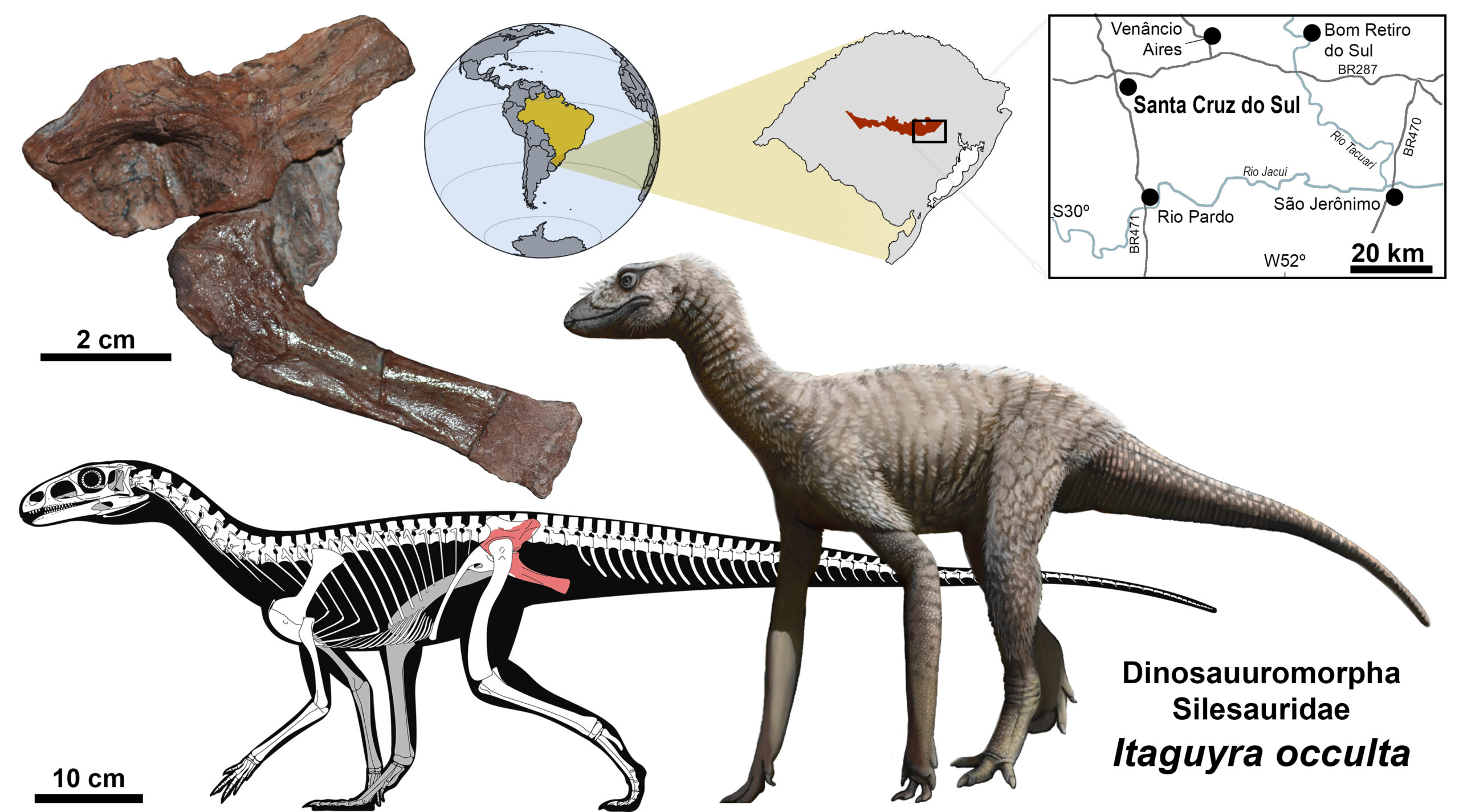Imagen 1. Itaguyra occulta, nueva especie de silesáurido. Fotografía de los huesos fosilizados de la cintura (característicos del grupo). Posición de las rocas del Triásico en Rio Grande do Sul (en rojo en el mapa) y ubicación de la ciudad de Santa Cruz do Sul. Reconstrucción del esqueleto (por Maurício Garcia) y la apariencia en vida (por Matheus F. Gadelha) de Itaguyra occulta realizada por comparación con parientes cercanos.